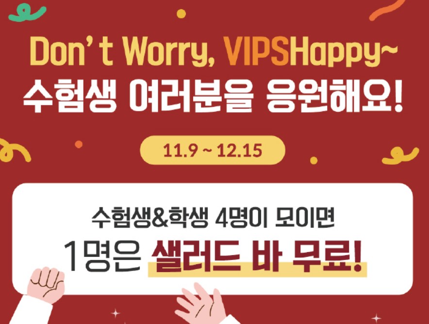 ■ 빕스 : 성인/청소년 샐러드바(정가) 4인 이상 이용 시, 수험생 또는 청소년 1인 샐러드바 무료(테이블 당 최대 1회)