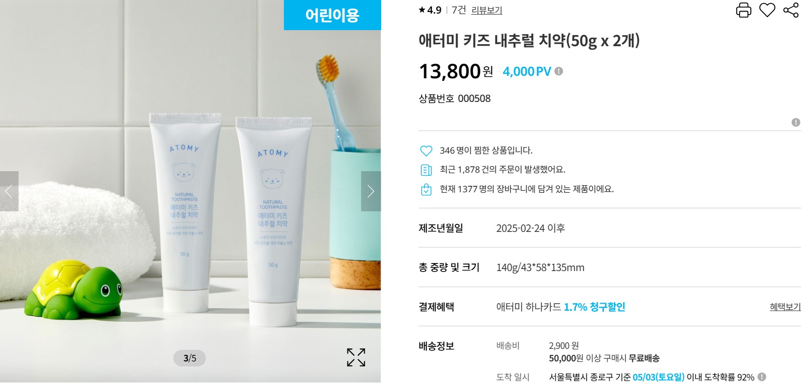 🦷 7. 애터미 키즈 내추럴 치약 (2개 / 13,800원)