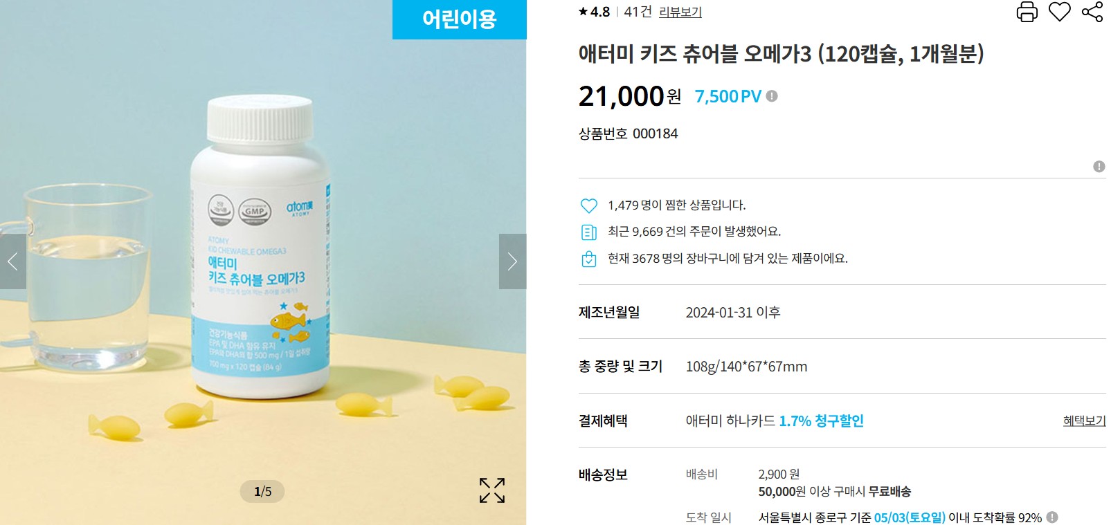 🧠 3. 애터미 키즈 츄어블 오메가3 (120캡슐 / 21,000원)