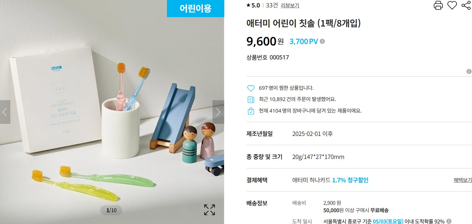 6. 애터미 어린이 칫솔 (8개입 / 9,600원)