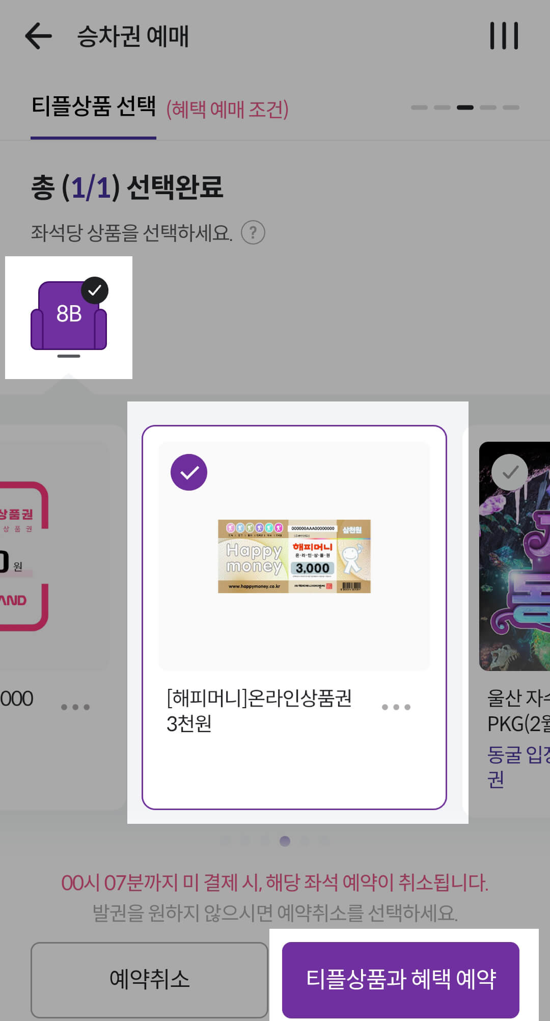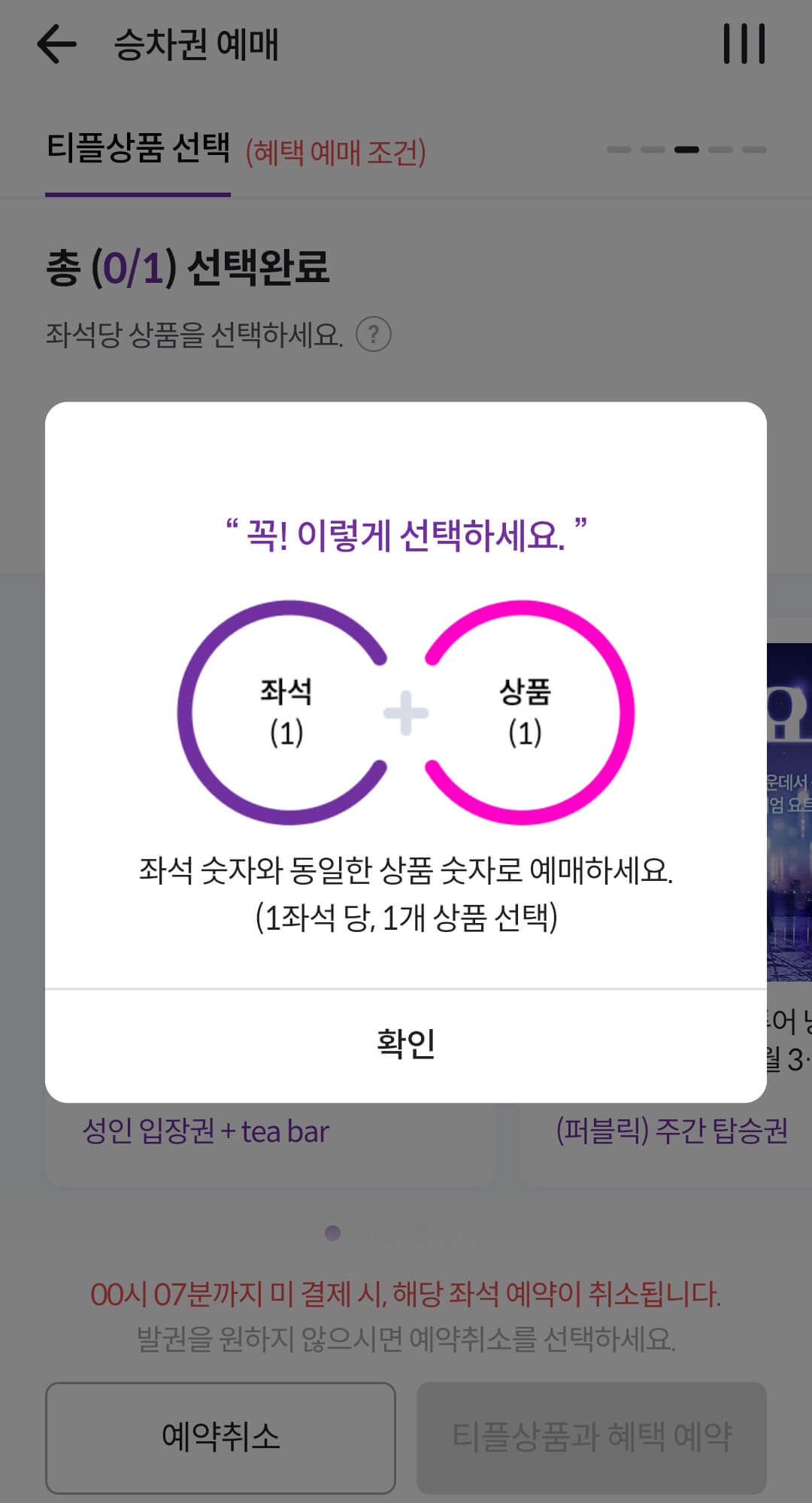 6. 좌석 + 티플상품 : 선택 시 좌석숫자와 동일한 상품 숫자로 예매할 것