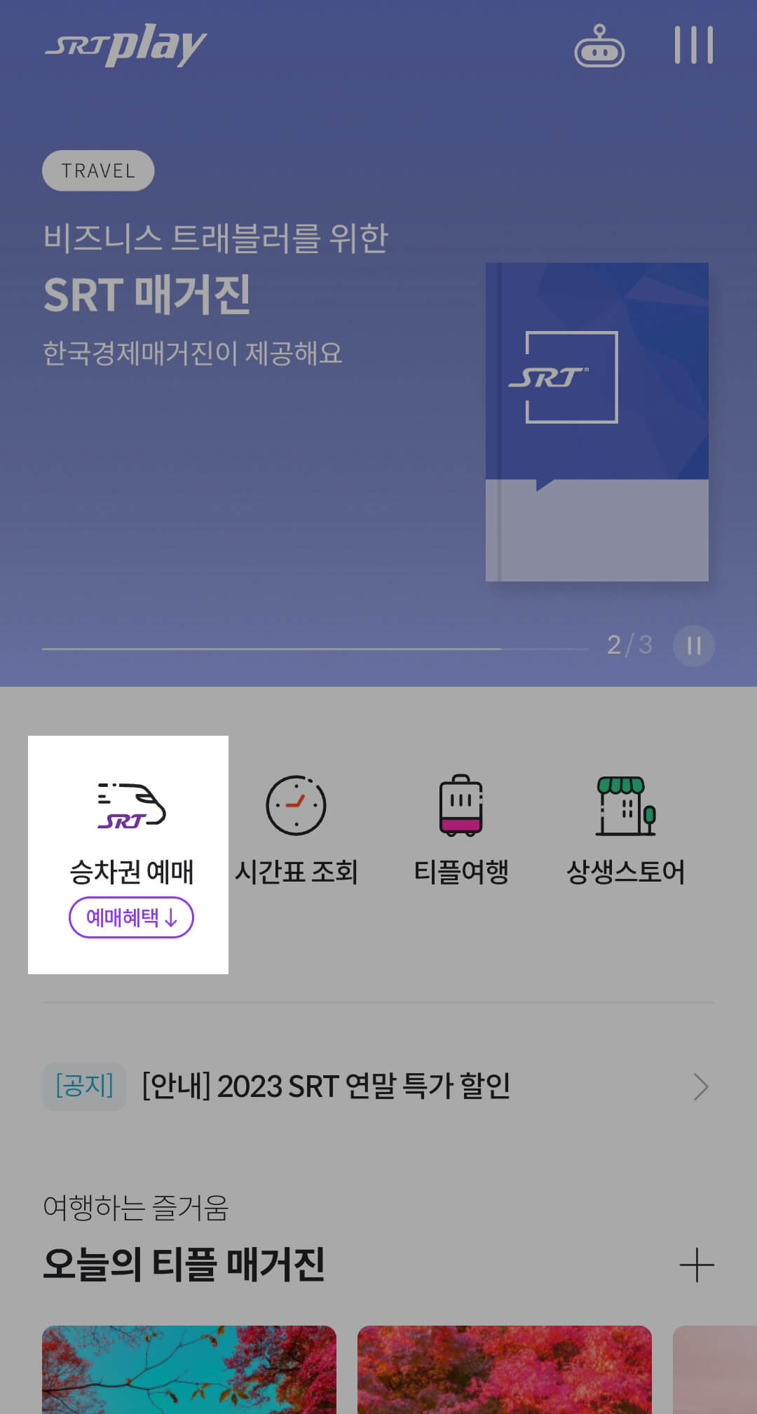 2023년 SRT 연말 특가 할인 열차운행 조정에 따라 티플승차권의 판매일시 중단되었습니다.